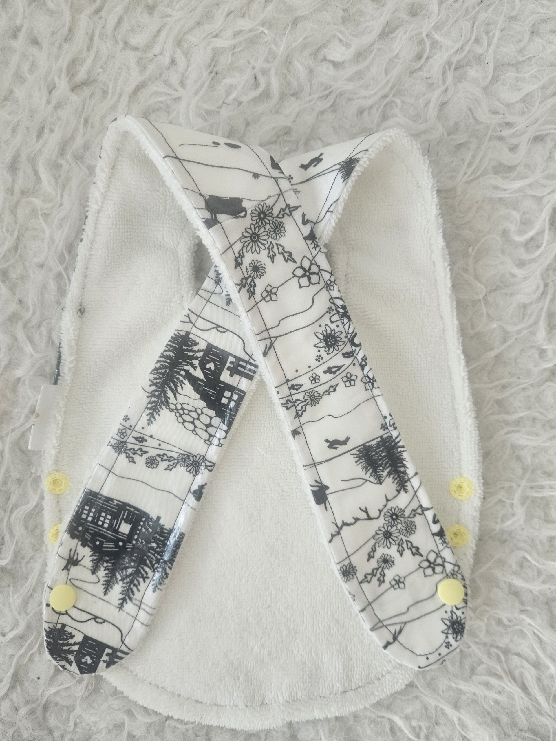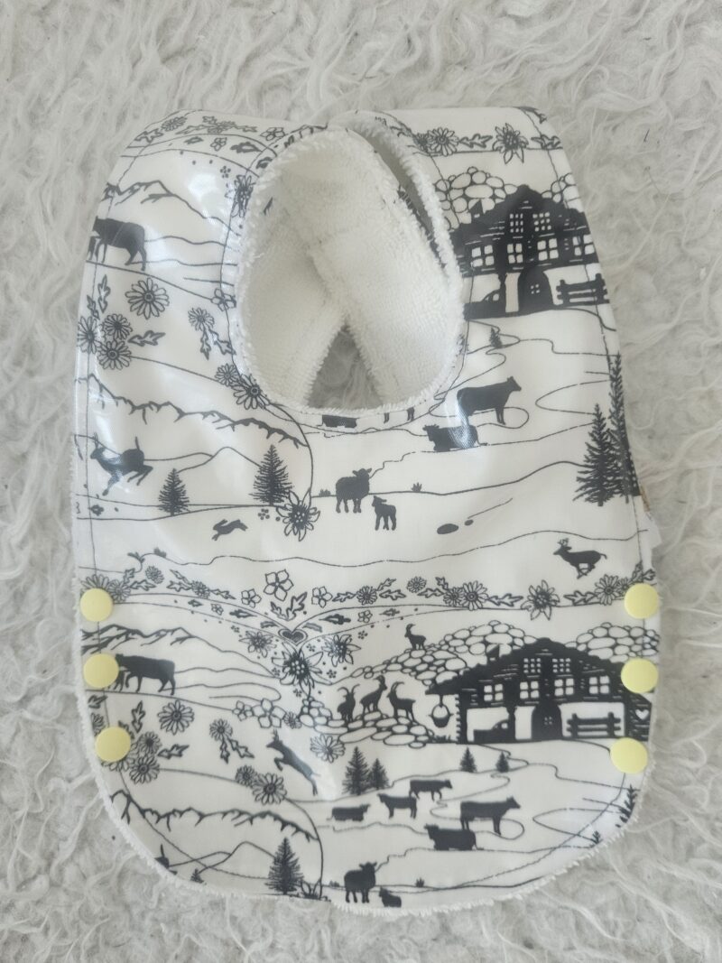 Cette bavette se croise dans le dos et se croche sur les côtés avec trois niveaux de pressions pour un meilleur confort et une plus longue utilisation. Le coton enduit permets un nettoyage plus rapide.