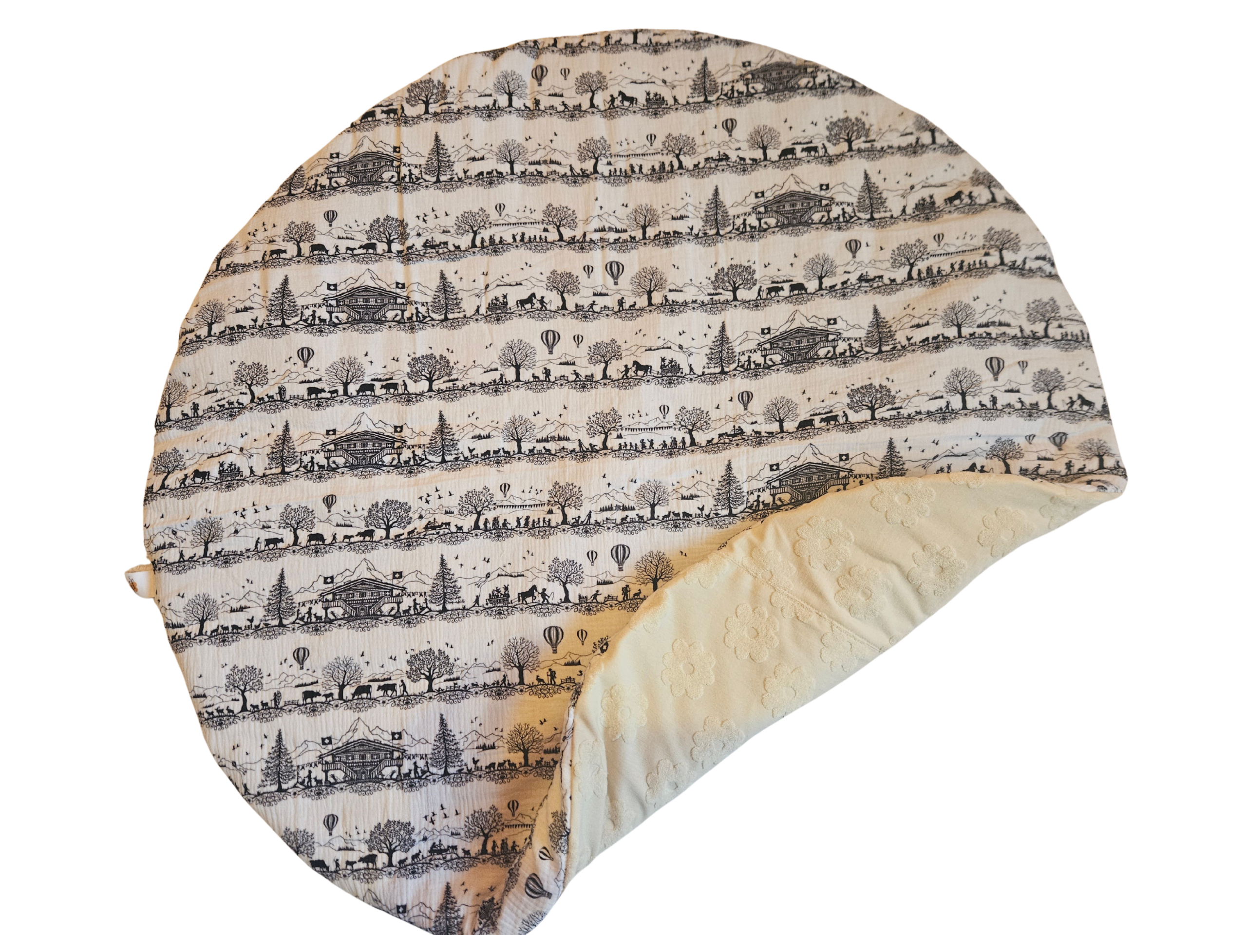 Ce tapis d’éveil est composé de trois couches: double gaze, une couche de ouate de rembourrage recyclée et une couche de tissu éponge. Moelleux, confortable, idéale pour poser vos petits trésors.