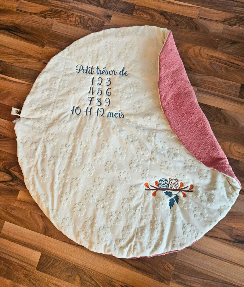 Ce tapis d’éveil est composé de trois couches: Double gaze, ouate de rembourrage recyclée et tissu éponge. Moelleux, confortable, idéale pour poser vos petits trésors. La broderie ludique ajoute une touche de mignonnerie et vous permettra de prendre une jolie photo chaque mois grâce aux chiffre brodés.